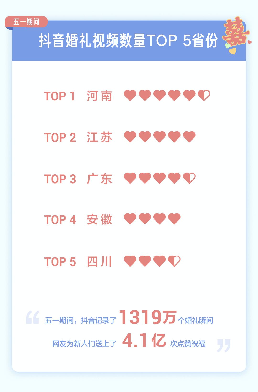 五一之际,也是婚礼处于高峰期之时 ,抖音记录下的,可是有着1319万个婚礼瞬间。论婚礼视频发布数量最多的 用户属河南的。网友们借助点赞 ,这点赞的累计次数达到4.1亿次 ,以此传递祝福 ,平台摇身一变 ,成了承载以及分享普通人重要人生时刻的公共空间 ,且充满着生活气息。
